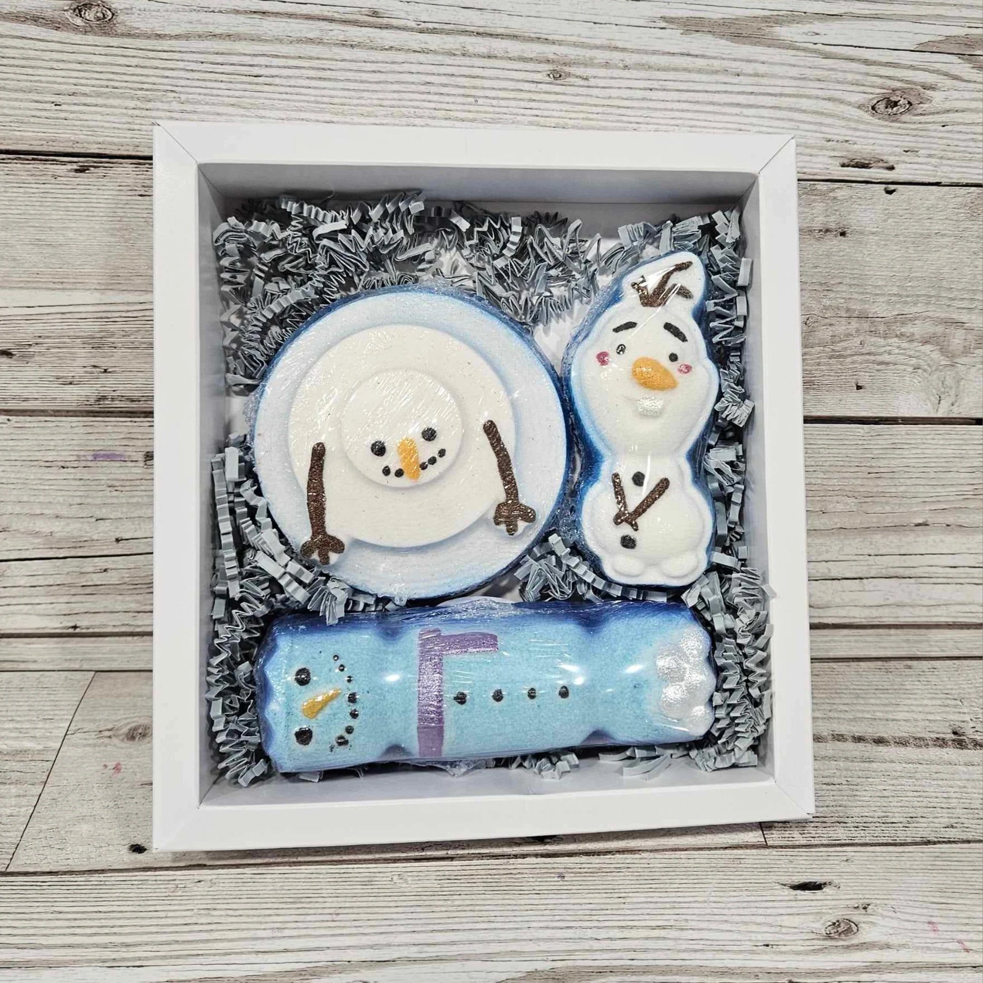 Set of 3 Snowman themed bath bombs in a presentation box.