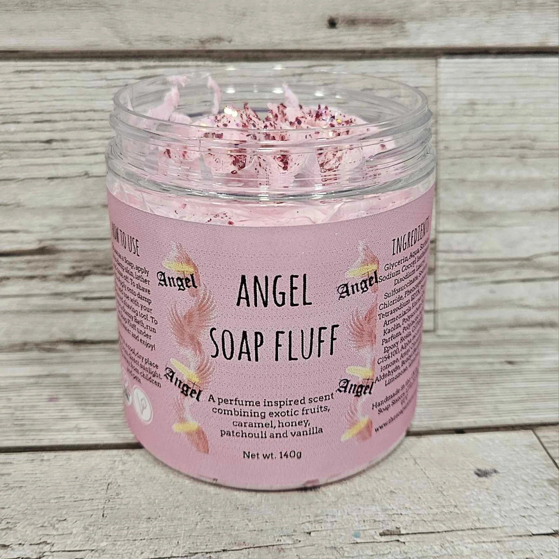 Angel Soap Fluff is scented in a luxurious blend of exotic fruits, caramel and honey combined with Patchouli and Vanilla.