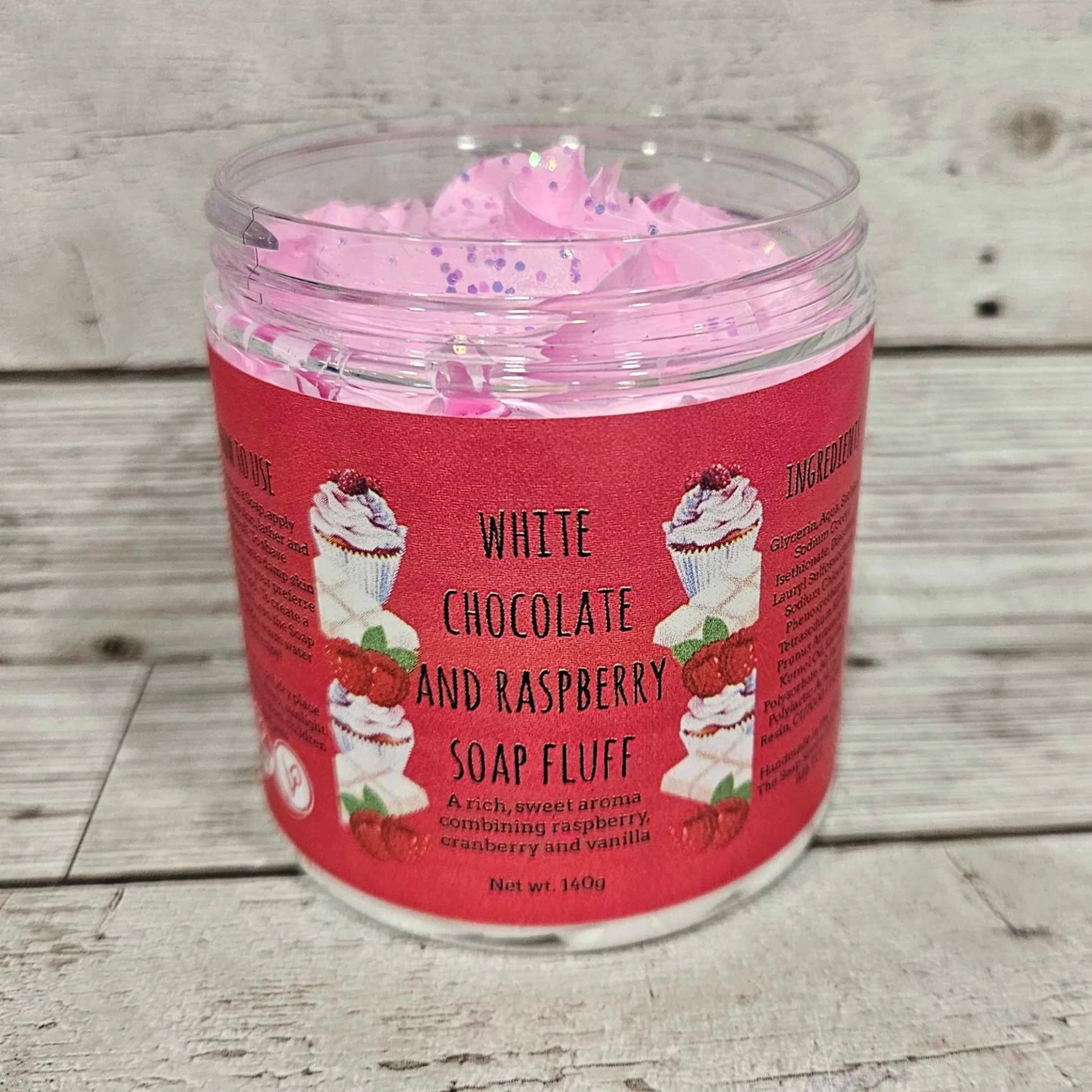 White Chocolate and Raspberry Soap Fluff is scented with a rich, sweet aroma combining raspberry, cranberry and vanilla.