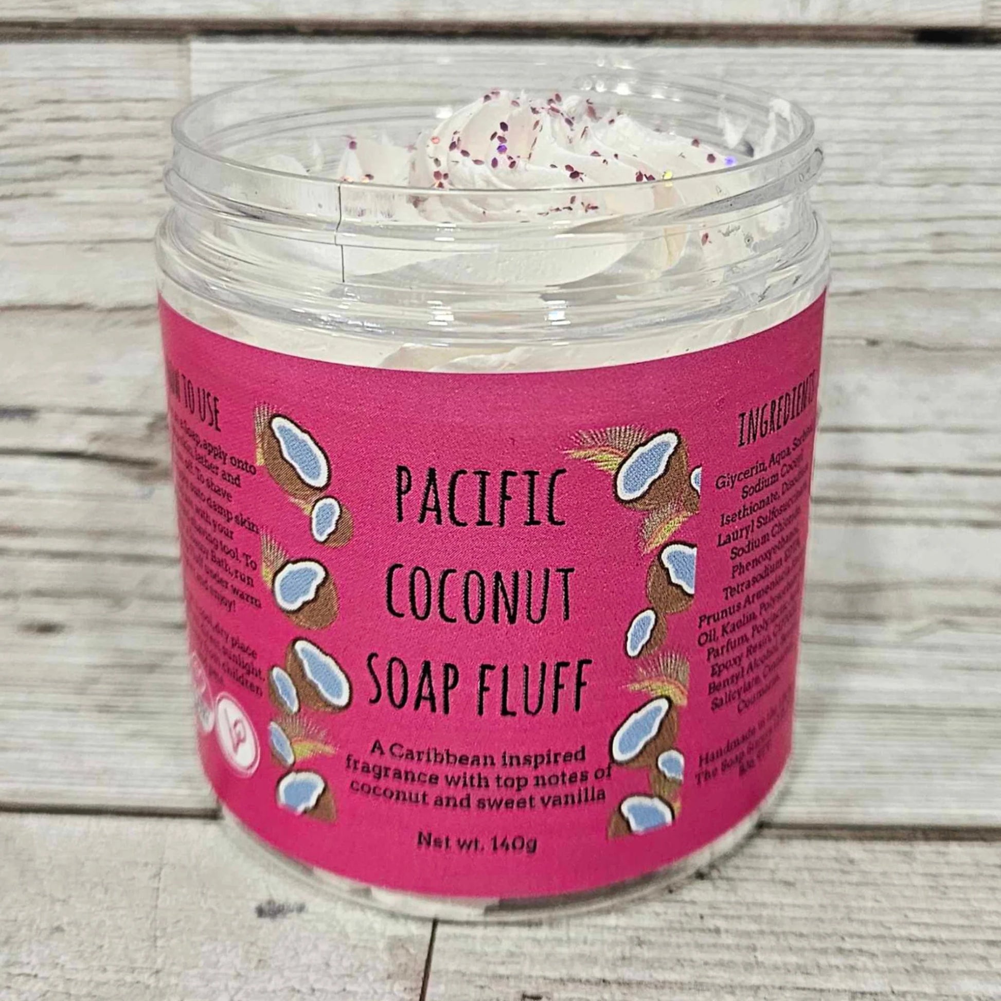 Pacific Coconut Soap Fluff is scented in a Caribbean inspired fragrance with top notes of coconut and sweet vanilla.