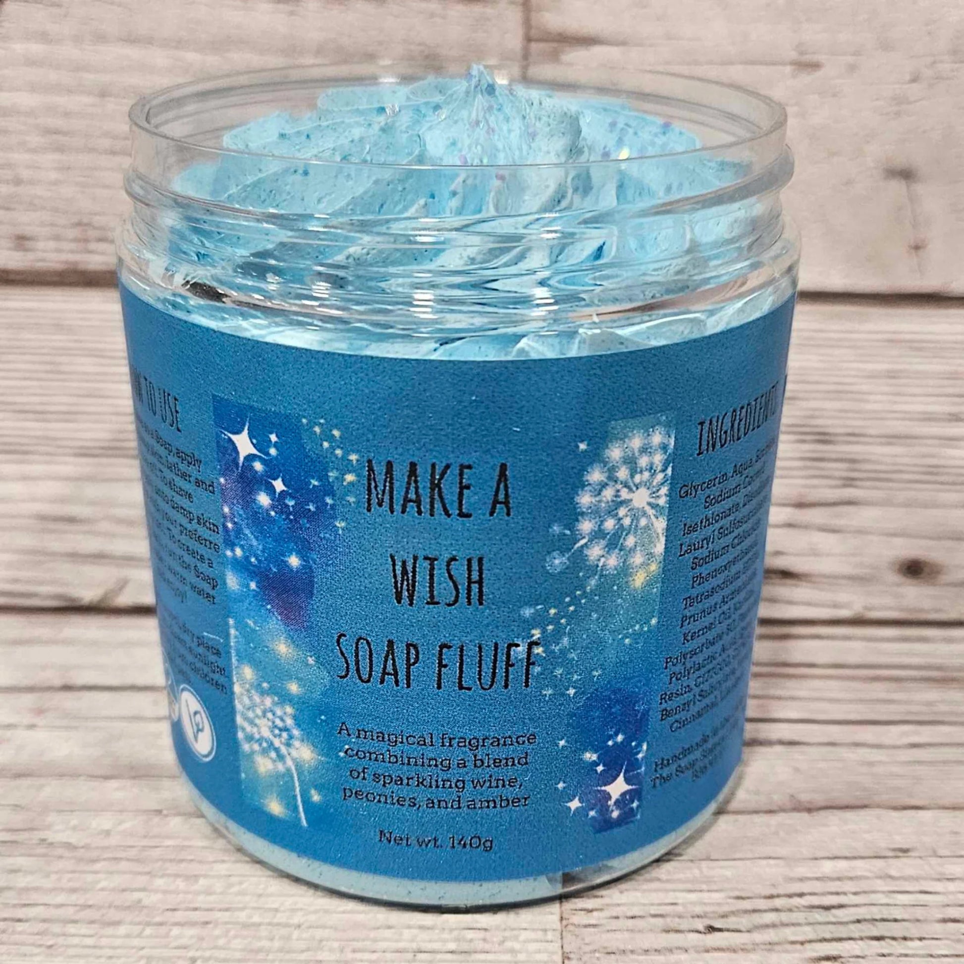Make a Wish Soap Fluff is scented in a blend of sparkling wine, Peonies, Amber and Amaretto.