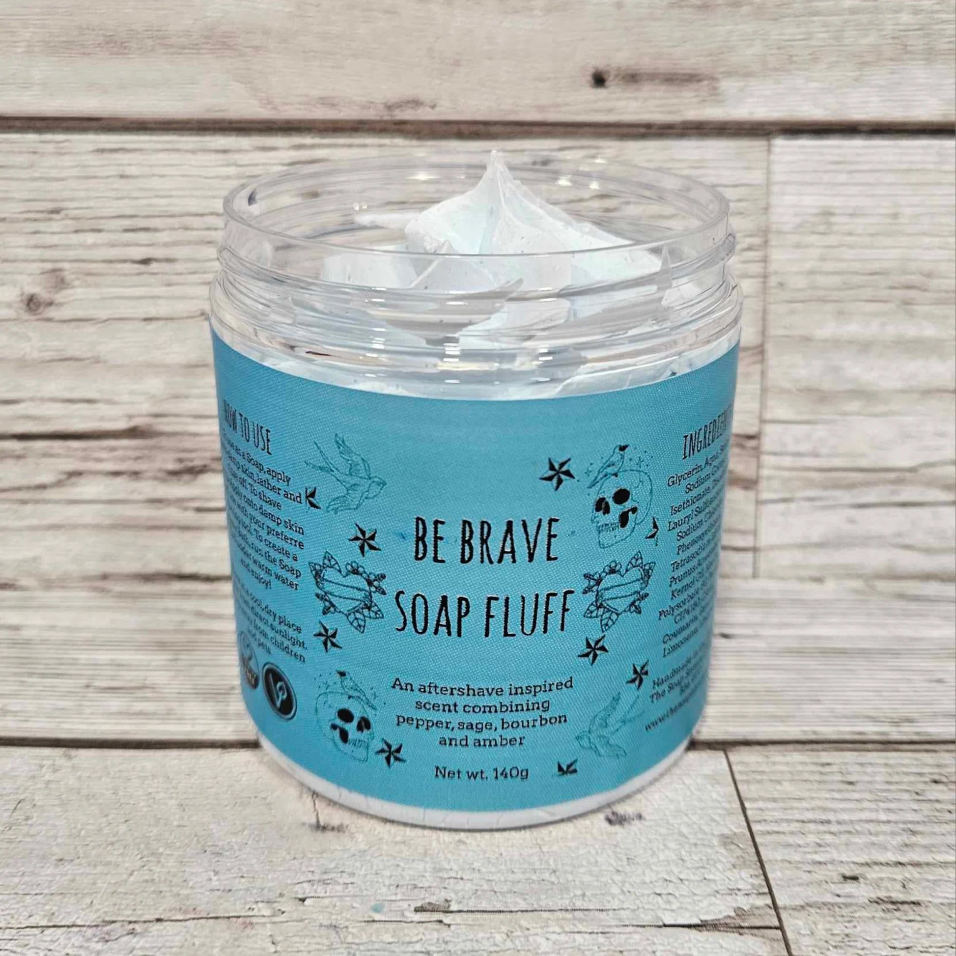Be Brave Soap Fluff is scented in an Aftershave inspired fragrance with a woody/spicy scent with pepper, sage bourbon and amber.